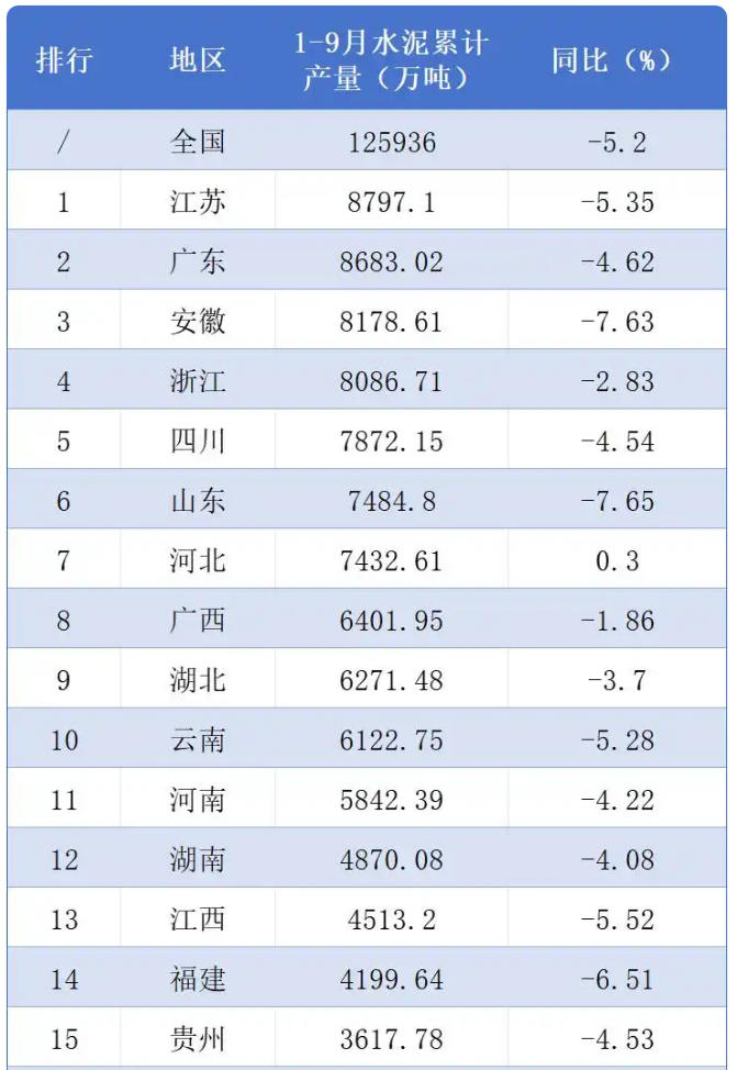 国家统计局数据显示,9水泥产量为1.54亿吨,同比下降8.6%;1-9月水泥产量为12.59亿吨,同比下降5.2%。
