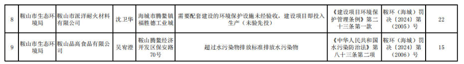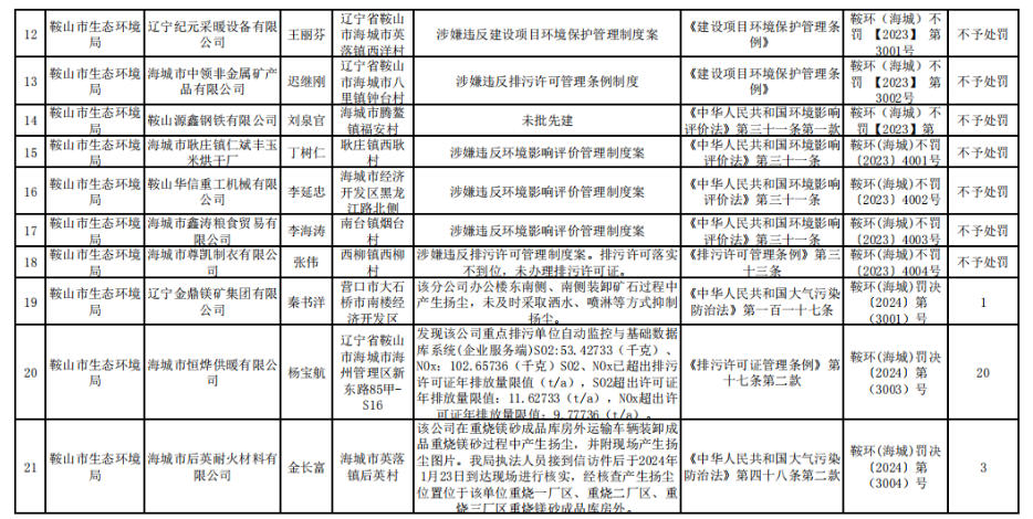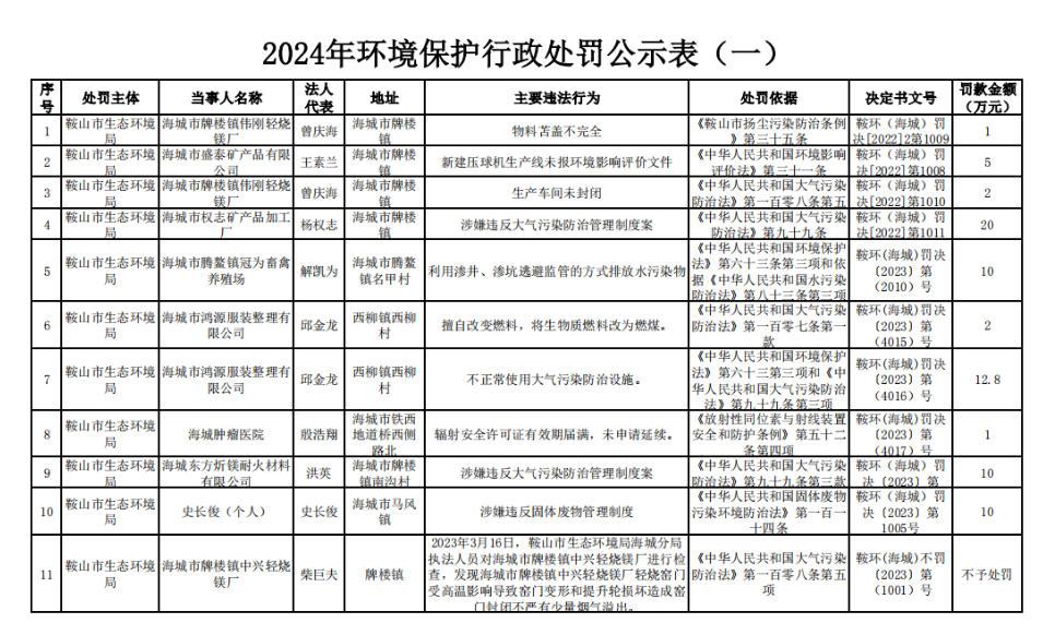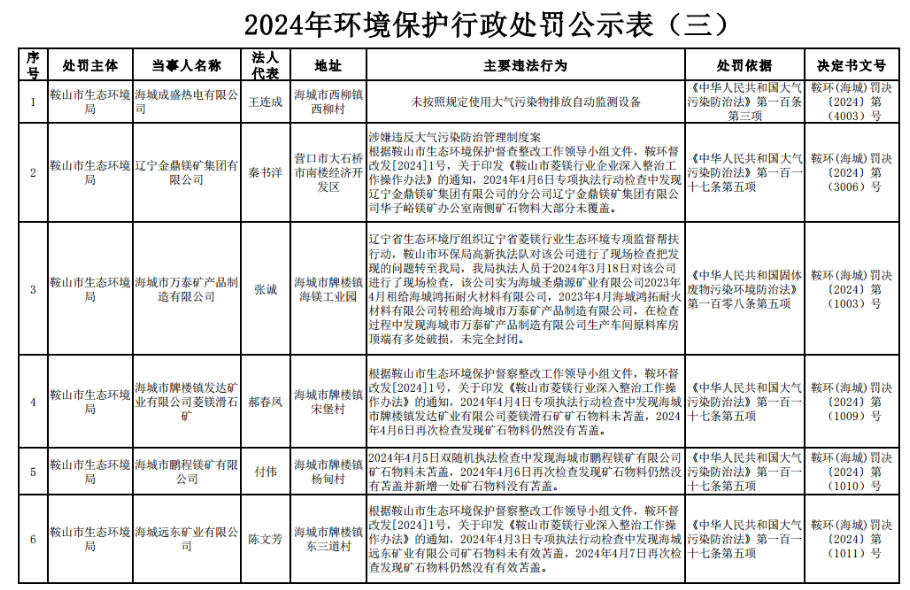 海城市2024年环境保护行政处罚公示表 涉及多家菱镁企业