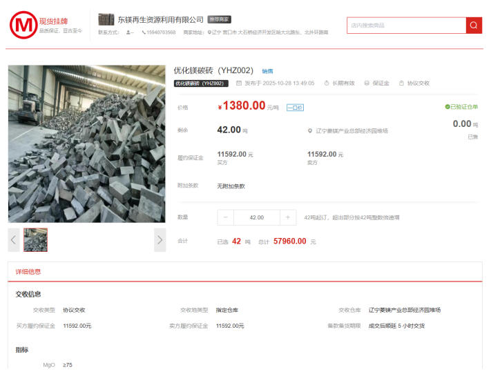 东北亚镁质材料交易中心(以下简称“东镁中心”)是全国唯一的镁质材料专业交易平台,东镁中心是东镁再生资源的战略合作单位,东镁再生资源所有废旧耐火材料都将通过东镁中心现货交易平台进行“电子仓单+挂牌交易”。东镁中心作为独立第三方,对废旧耐材的收购、仓储、交易全过程实施严格监管,确保流程规范、价格公开透明。整个流程中产生的合同、资金流等关键数据均由平台实时记录并全程留痕,并同步到税务部门,实现商流、资金流和发票流合一并可追溯、可核查。相关交易数据由东镁中心进行保存,用于相关部门实时监督与事后审计,从机制上防范虚开风险,保障交易的公平公正,信息公开透明,也便于监管部门的实时监控,保障政府及税务部门监管无死角。同时东镁中心通过大量数据整合资源,有效解决双方信息不对称的问题;还通过规范的第三方仓储监管,将废旧耐材转化为标准化仓单,可进行仓单质押融资和其他供应链金融相关服务;还定期发布市场供需动态、价格走势、技术创新等信息,同时规范的交易流程和系统管理,给行业和企业进行技术和信息赋能。通过东镁中心的全方位赋能,能够为废旧耐材行业的规模化、标准化和高值化发展提供重要支撑。