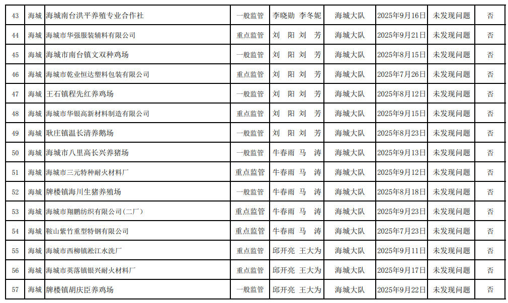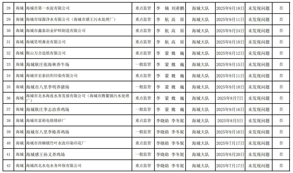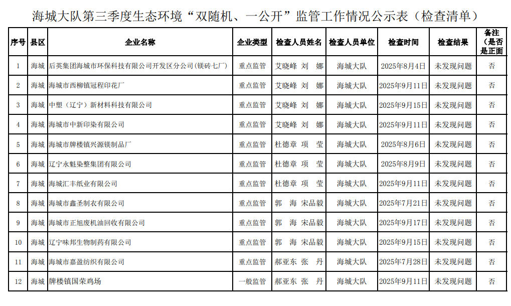 海城大队第三季度生态环境“双随机、一公开”监管工作情况公示表(检查清单) 含多家菱镁企业