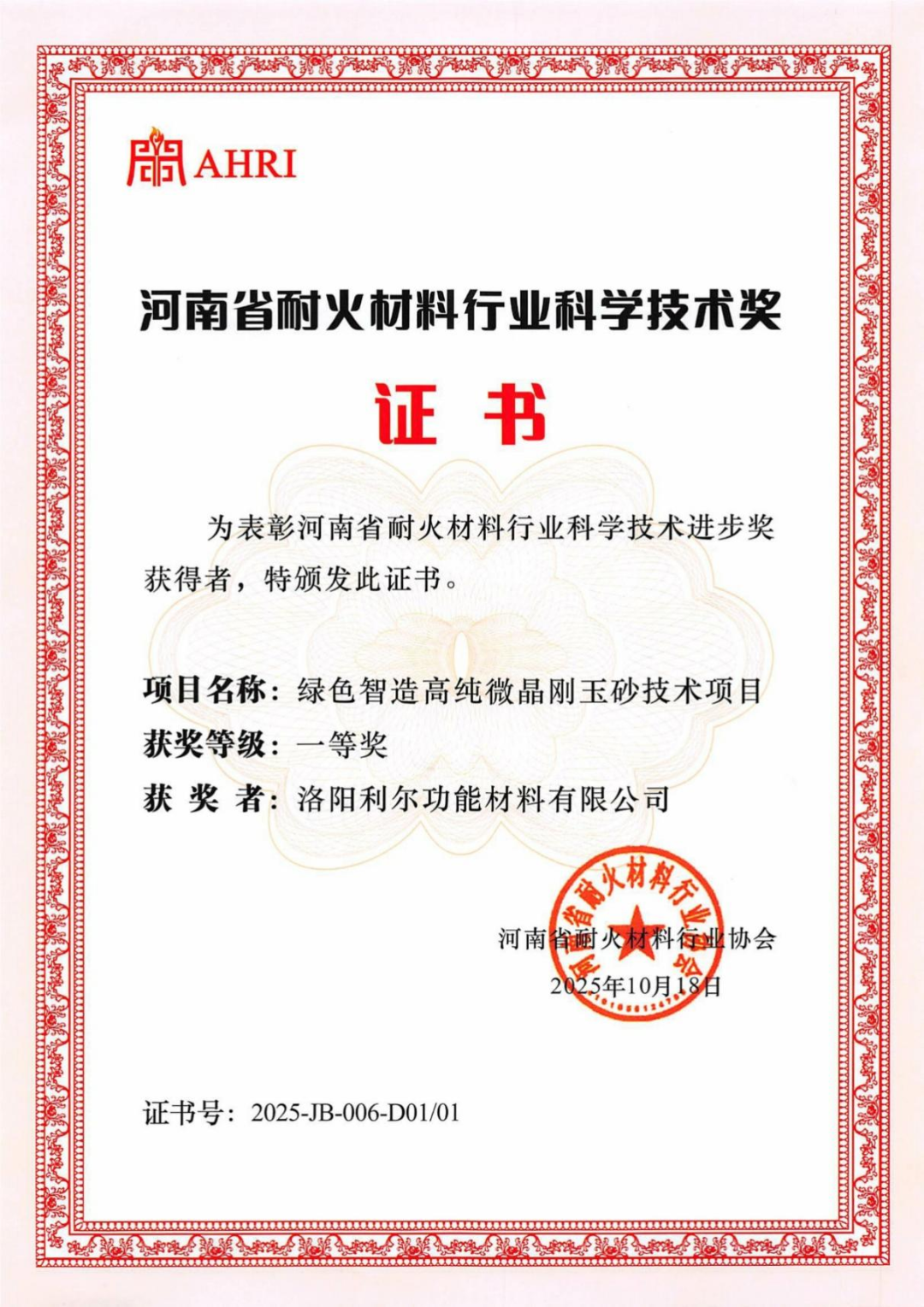 近日,2025年度河南省耐火材料行业科学技术奖评选结果揭晓,洛阳利尔功能材料有限公司申报的“绿色智造高纯微晶刚玉砂技术项目”脱颖而出,荣获科学技术进步奖一等奖,标志着该公司在高端耐火材料绿色制造与智能化生产领域取得重大突破。