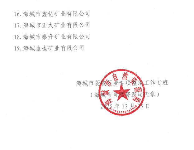 根据鞍山市菱镁产业发展工作专班《关于鞍山市2025年第4季度菱镁矿产量控制指标分配的通知》(鞍镁专班〔2025〕7号),现对海城市2025年第四季度菱镁矿产量控制指标分配情况予以公告。