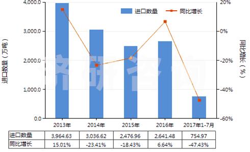 图 2013-2017年7月中国无烟煤(HS27011100)进口量及增速统计