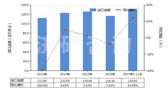 图 2013-2017年11月中国人造石墨(HS38011000)进口总额及增速统计