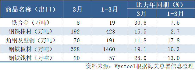 3月,中国出口钢铁棒材192万吨,同比增长15.5%;1-3月累计出口423万吨,同比增长2.7%。其他出口情况如下表所示:
