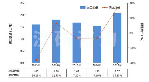 图 2013-2017年中国人造石墨(HS38011000)进口量及增速统计