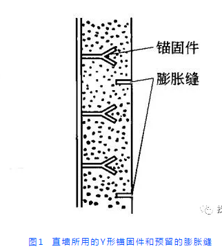 耐火浇注料广泛使用锚固件。金属锚固件有Y形、V形、L形等形状,截 面有圆形的,也有其他形状的。图1显示了直墙所用的Y形锚固件和预留的膨胀缝。