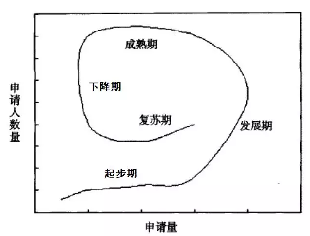 基本发明向纵向和横向发展,其应用发明专利逐渐出现。在该阶段,技术有了突破性的进展,市场扩大,介入的企业增多,专利申请量与专利申请人数量会急剧上升。