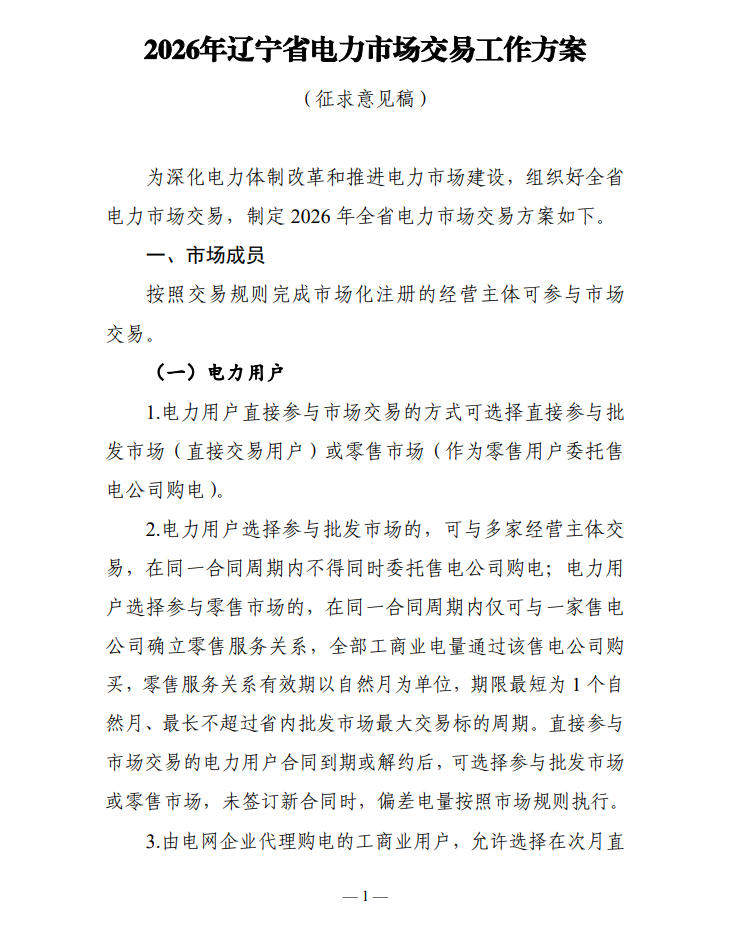 为组织好2026年全省电力市场交易,结合我省实际,辽宁省工业和信息化厅、辽宁省发展和改革委员会共同起草了《2026年辽宁省电力市场交易工作方案》(征求意见稿)现向社会各界公开征求意见,并于2025年10月28日前将反馈意见函至电子邮箱。