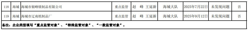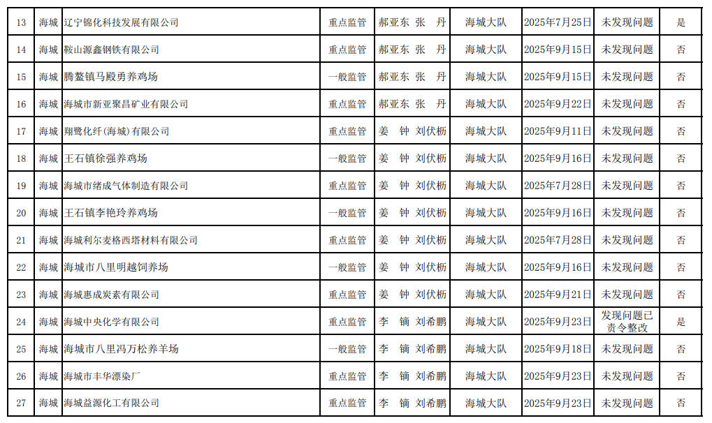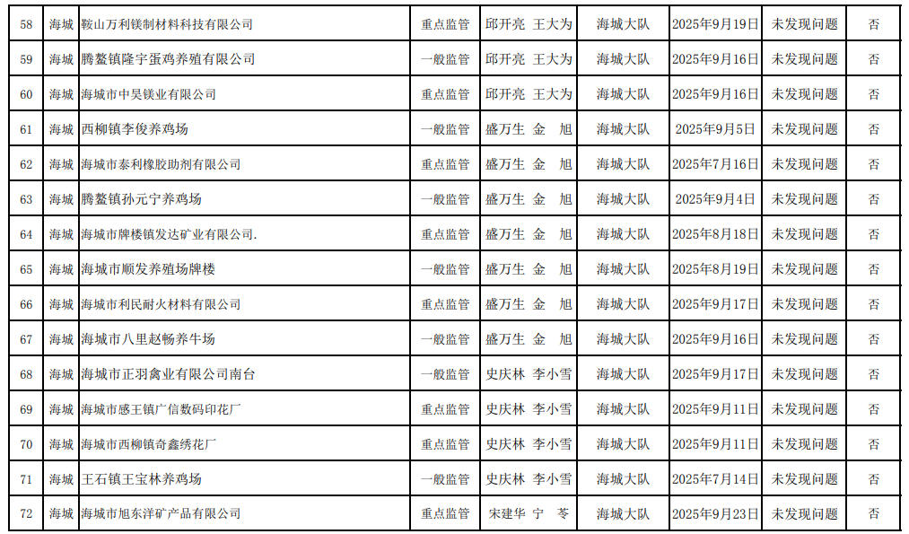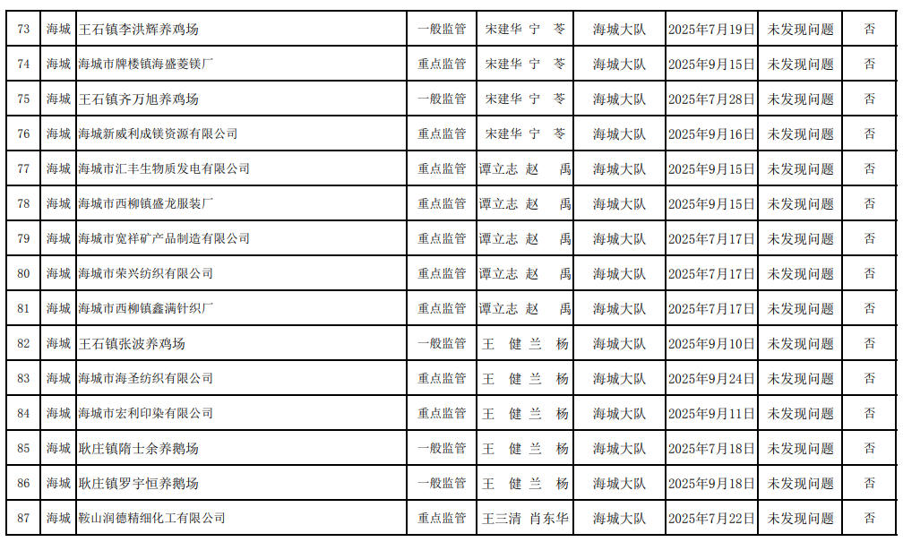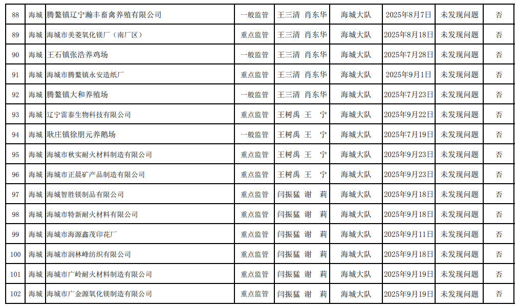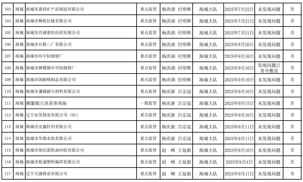 海城大队第三季度生态环境“双随机、一公开”监管工作情况公示表(检查清单) 含多家菱镁企业