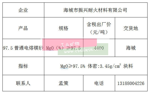11月11日海城市振兴耐火材料有限公司97.5普通电熔镁砂参考报价