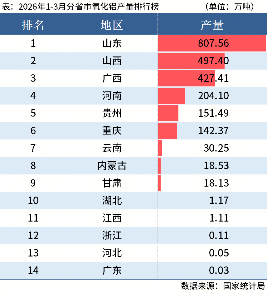 国家统计局数据显示,2026年3月中国氧化铝产量761.1万吨,同比增长1.8%;1-3月累计产量2299.7万吨,同比增长1.7%。