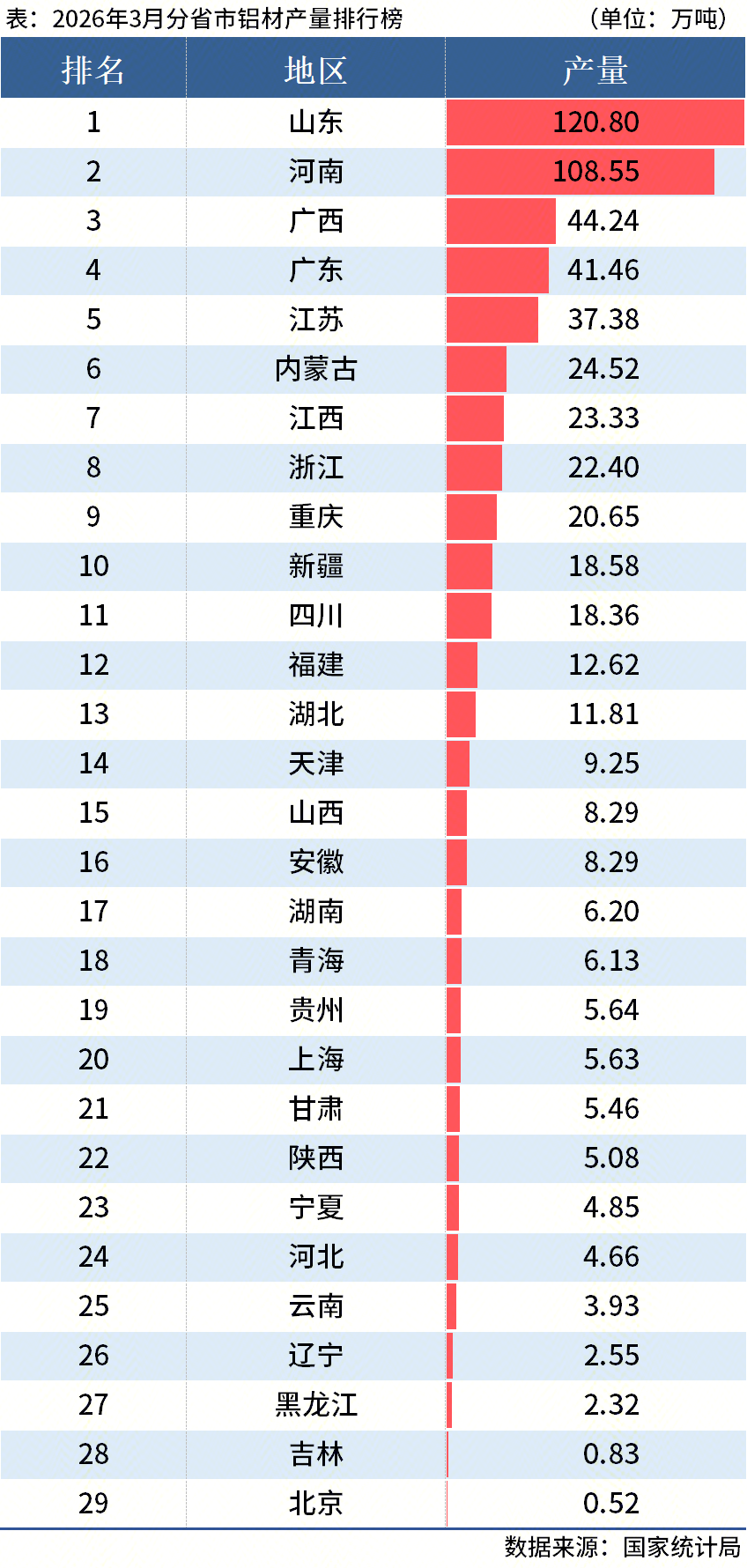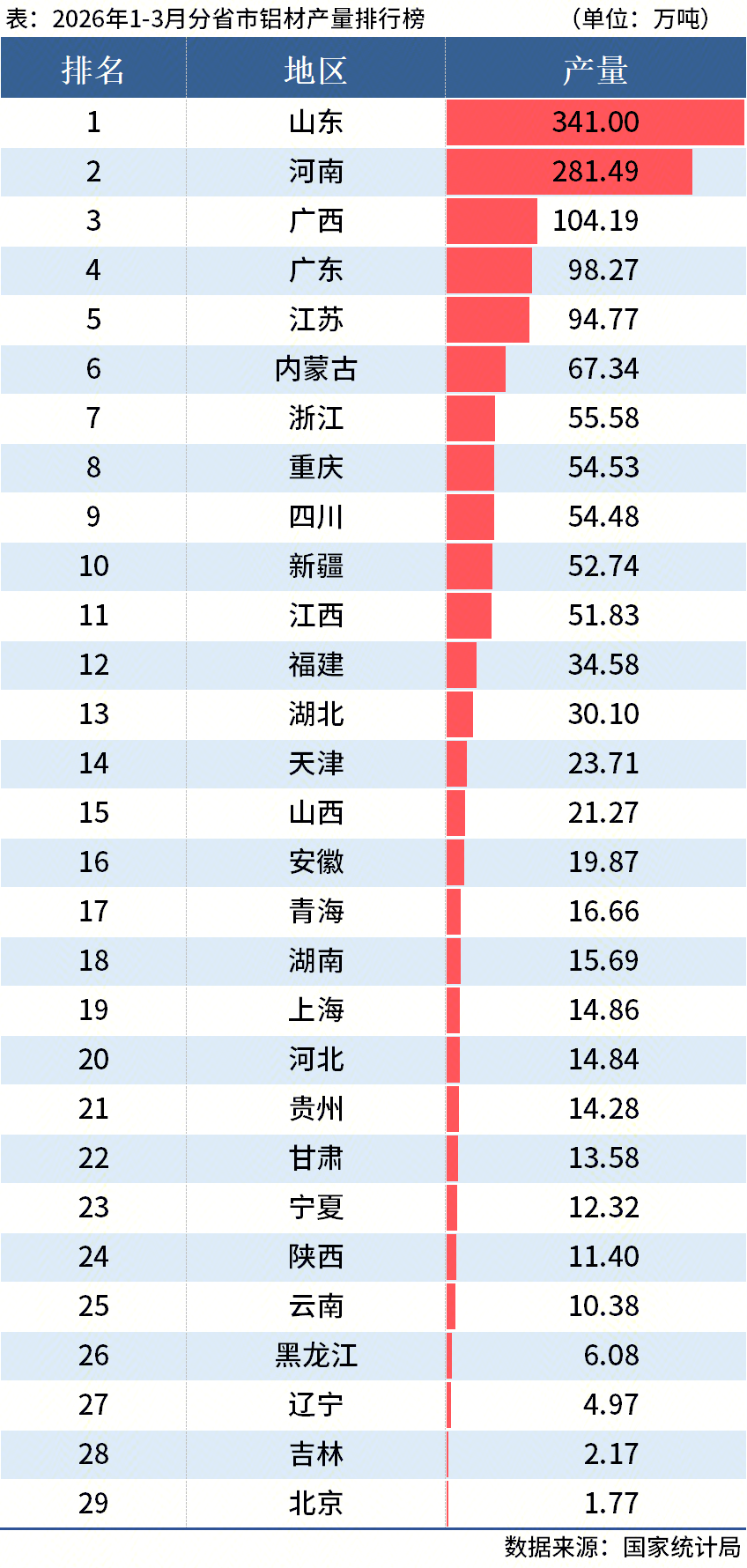 国家统计局数据显示,2026年3月中国铝材产量584.3万吨,同比下降3.1%;1-3月累计产量1524.8万吨,同比下降1.9%。