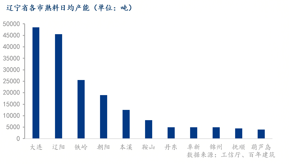 根据辽宁省近50条产量总规模来看,辽宁省日产能总计约18.25万吨,停窑40天,预计影响当地熟料产量约700万吨。