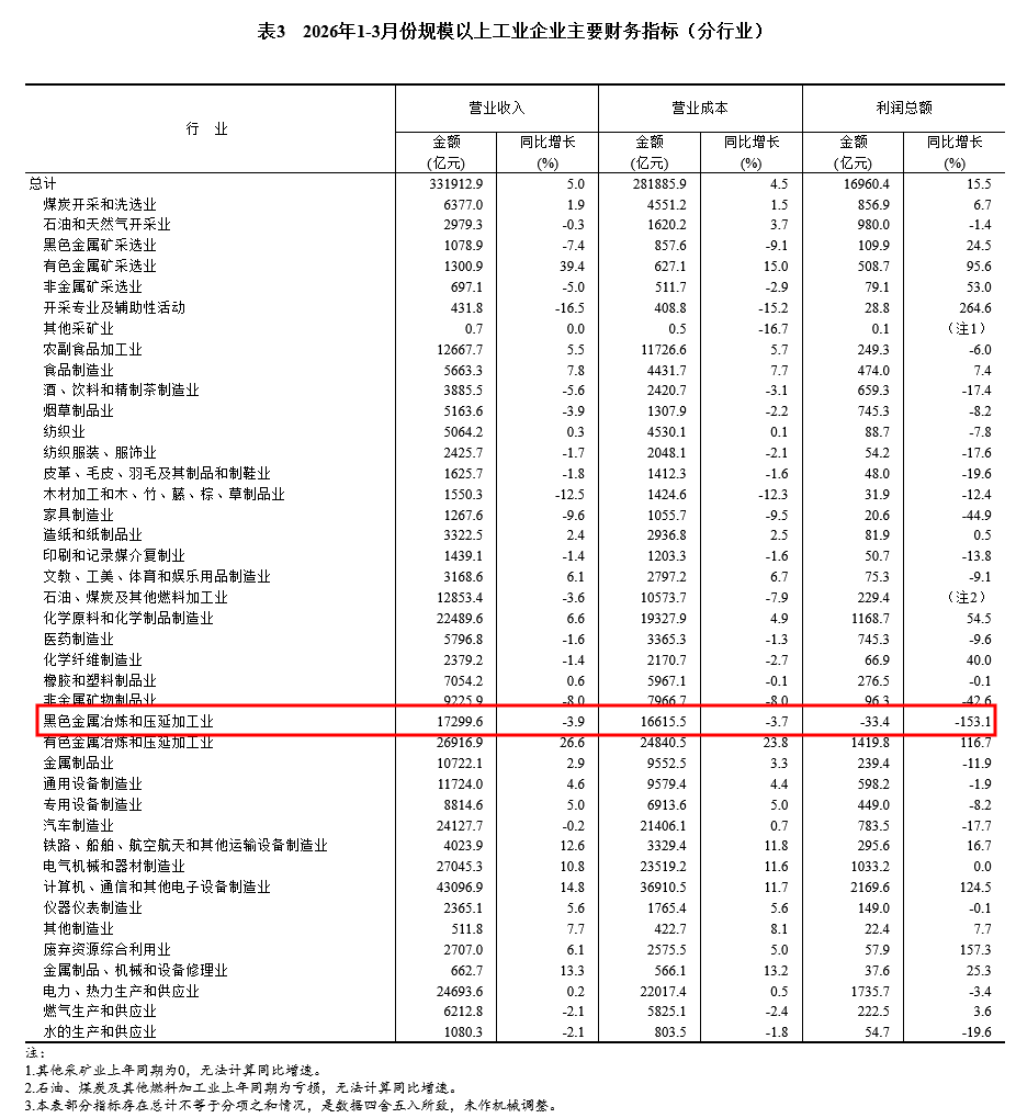 1—3月份,黑色金属冶炼和压延加工业利润总额-33.4亿元。