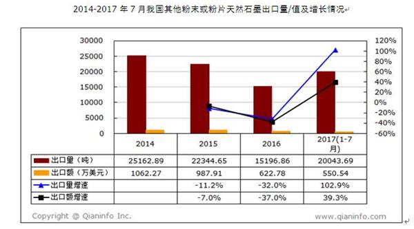 据中国高纯石墨市场前景调查分析报告显示,2015年我国其他粉末或粉片天然石墨出口量为22344.65吨,出口额为987.91万美元;2016年该产品出口量为15196.86吨,同比下降32%,出口额为622.78万美元,同比下降37%;2017年1-7月该产品出口量为20043.69吨,同比上升102.9%,出口额为550.54万美元,同比上升39.3%。