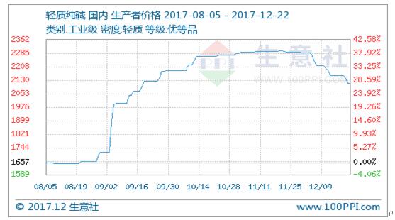 行业:据价格监测,2017年12月21日氯碱产业价格涨跌榜中上涨的商品共1种,下跌的商品共1种,涨跌为0的商品共3种。上涨的主要商品有:PVC(6635, 0.00, 0.00%)(0.46%);下跌的主要商品有:轻质纯碱(-1.33%)。本日均涨跌幅为-0.18%。