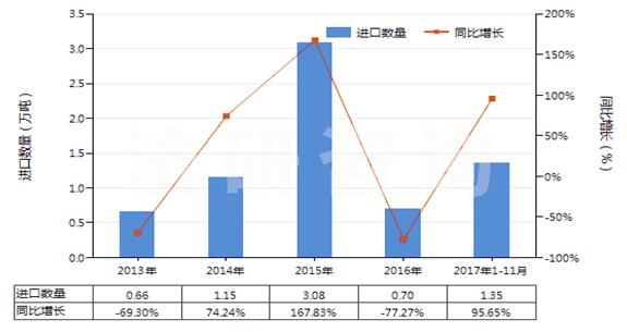 图 2013-2017年11月中国其他粉末状天然石墨(HS25041099)进口量及增速统计