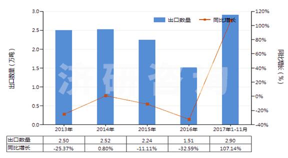 图 2013-2017年11月中国其他粉末状天然石墨(HS25041099)出口量及增速统计